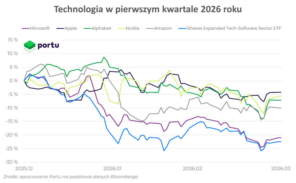 Dotychczasowy motor wzrostów rynkowych nie spełnił oczekiwań inwestorów w pierwszym kwartale. Sektor technologiczny znalazł się wręcz wśród największych przegranych. Najsłabiej wypadł amerykański segment oprogramowania. Indeks S&P North American Expanded Technology Software spadł o 24% w związku z obawami o to, że sztuczna inteligencja może zaburzyć model Software as a Service. Rynek dostrzega ryzyko, że postępy, szczególnie w obszarze modeli takich jak Claude od Anthropica, zwiększają prawdopodobieństwo stopniowego zastępowania tradycyjnego oprogramowania przez agentów AI. Cały globalny sektor technologiczny stracił około 9%. Wśród tzw. wielkiej siódemki od początku roku najmocniej spadł Microsoft, tracąc 23%, następnie Meta 13%, Amazon 10%, Alphabet 8%, Nvidia 6,5% oraz Apple 6,7%.